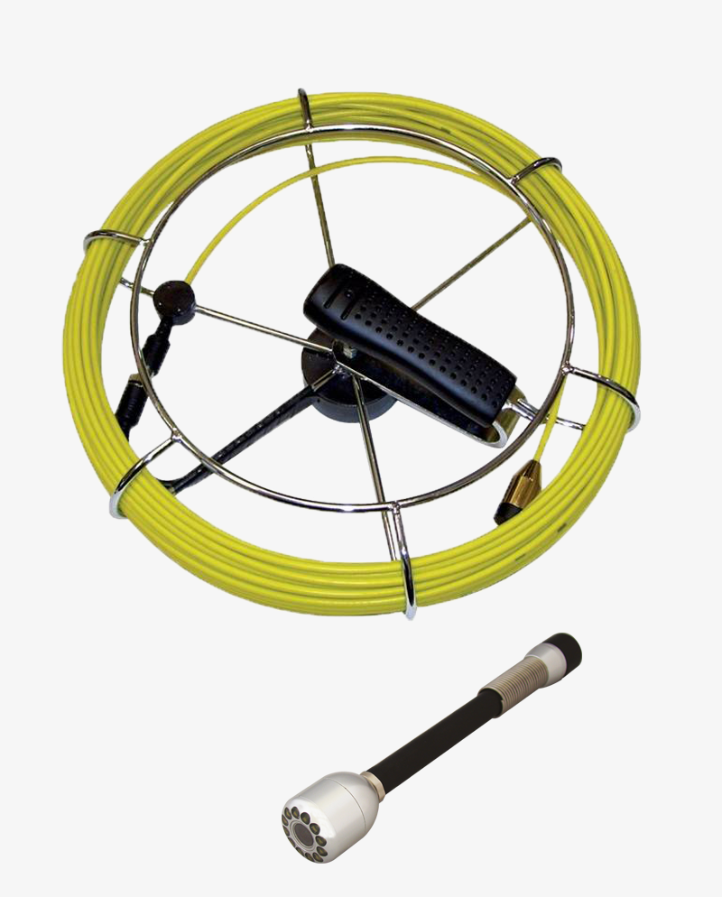Le kit comprend une caméra étanche avec des illuminateurs et un câble de poussée en fibre de verre semi-rigide.