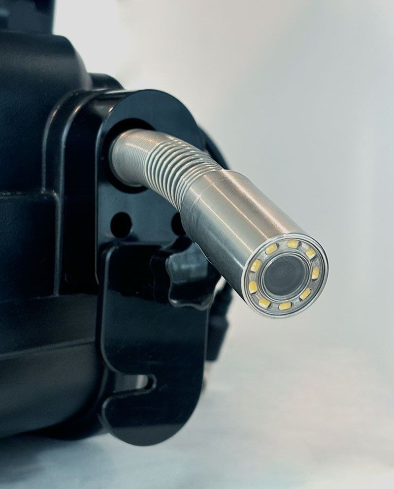 Le système intègre un enrouleur permettant de stocker et transporter facilement la caméra, protégée par une capsule avec crochet à baïonnette, qui facilite le support et le nettoyage du câble après inspection.